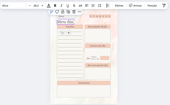 Com nosso planner digital, você pode alterar cores, fontes e figuras conforme desejar, garantindo que sua experiência de planejamento seja única e alinhada ao seu estilo pessoal.